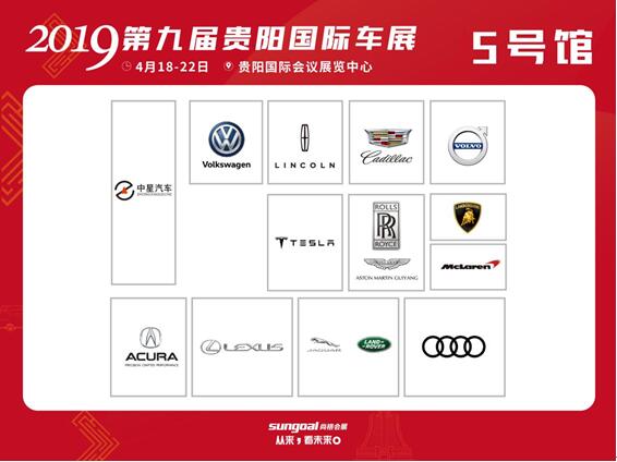5号馆(按顺时针方向):中星汽车、进口大众、林肯、凯迪拉克、沃尔沃、兰博基尼、迈凯伦、劳斯莱斯、阿斯顿马丁、特斯拉、奥迪、路虎、捷豹、雷克萨斯、讴歌