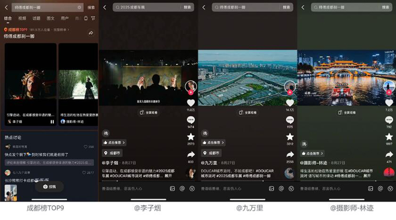 除了车展主话题运营之外,平台联动本地达人人打造趋势内容#师傅成都刹一脚 ,从成都本地文化特色出发为车展造势,聚焦成都非遗文化、先锋生活等不同视角,将汽车与成都巴适生活场景结合进行内容创作,引发本地用户情感共鸣。话题登上成都本地榜TOP9,在榜时长超72小时,累计播放量近千万,不仅成功为车展造势,更让车展与在地文化发生碰撞和共振。